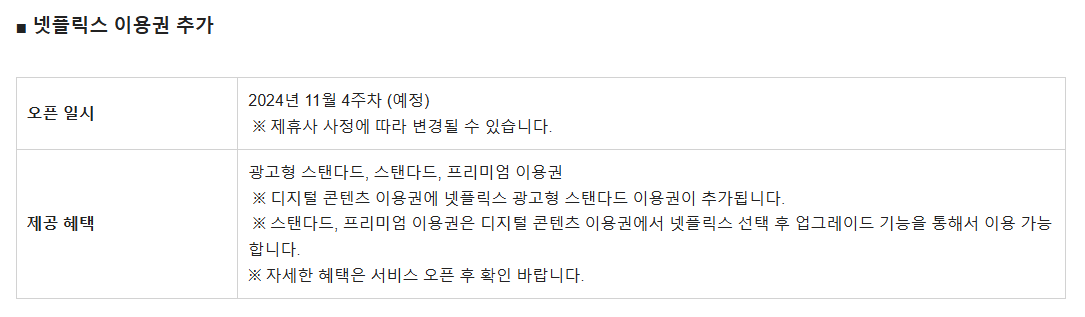 - 시리즈온 이용권 종료: 시리즈온 영화 무제한 이용권은 2024년 12월 12일 00:00부로 종료되므로, 해당 혜택을 이용 중인 경우 다른 콘텐츠로 변경해야 합니다.